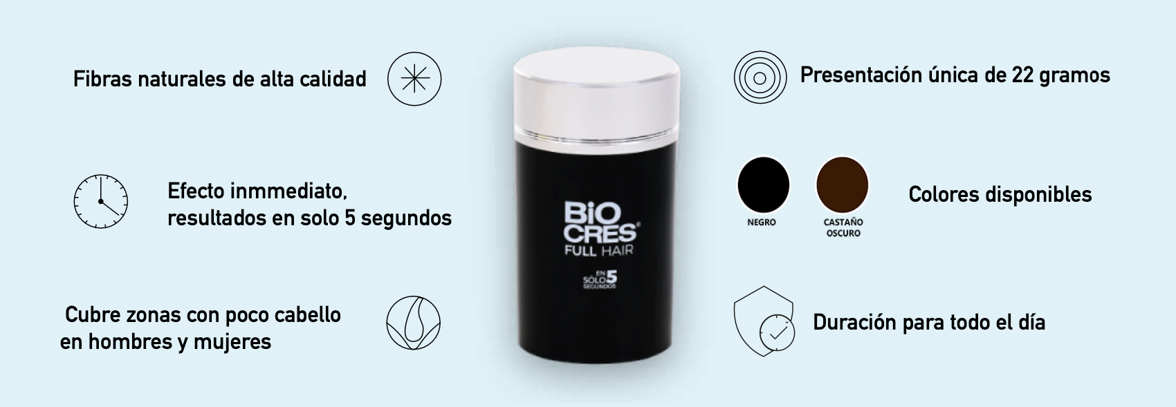 En solo 5 segundos cubrirás zonas sin cabello. Biocres Full Hair cabello al instante.